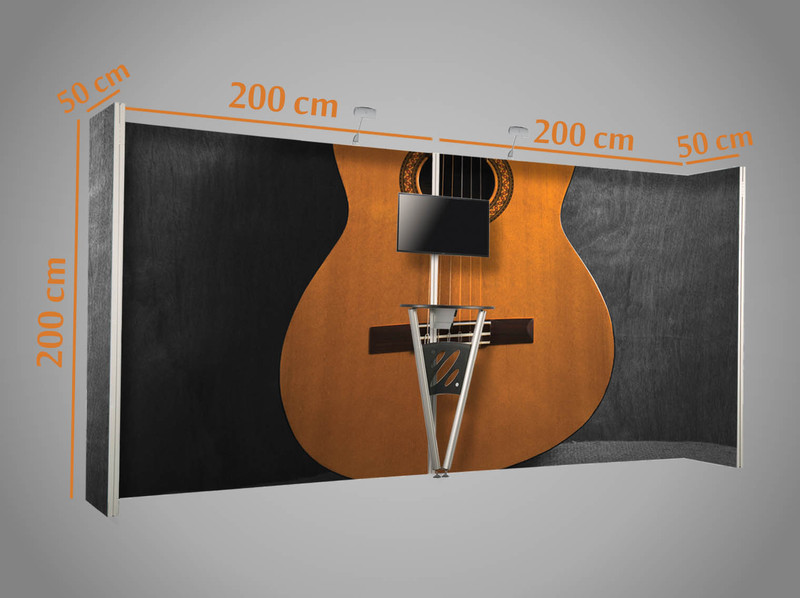 Ce kit comprend 28 profilés à assembler, 6 éléments d'angles à assembler, 2 visuels en textile opaque de 200 X 200 cm et 2 de 200 X 50 cm avec joncs en périphérie prêt à mettre en place.